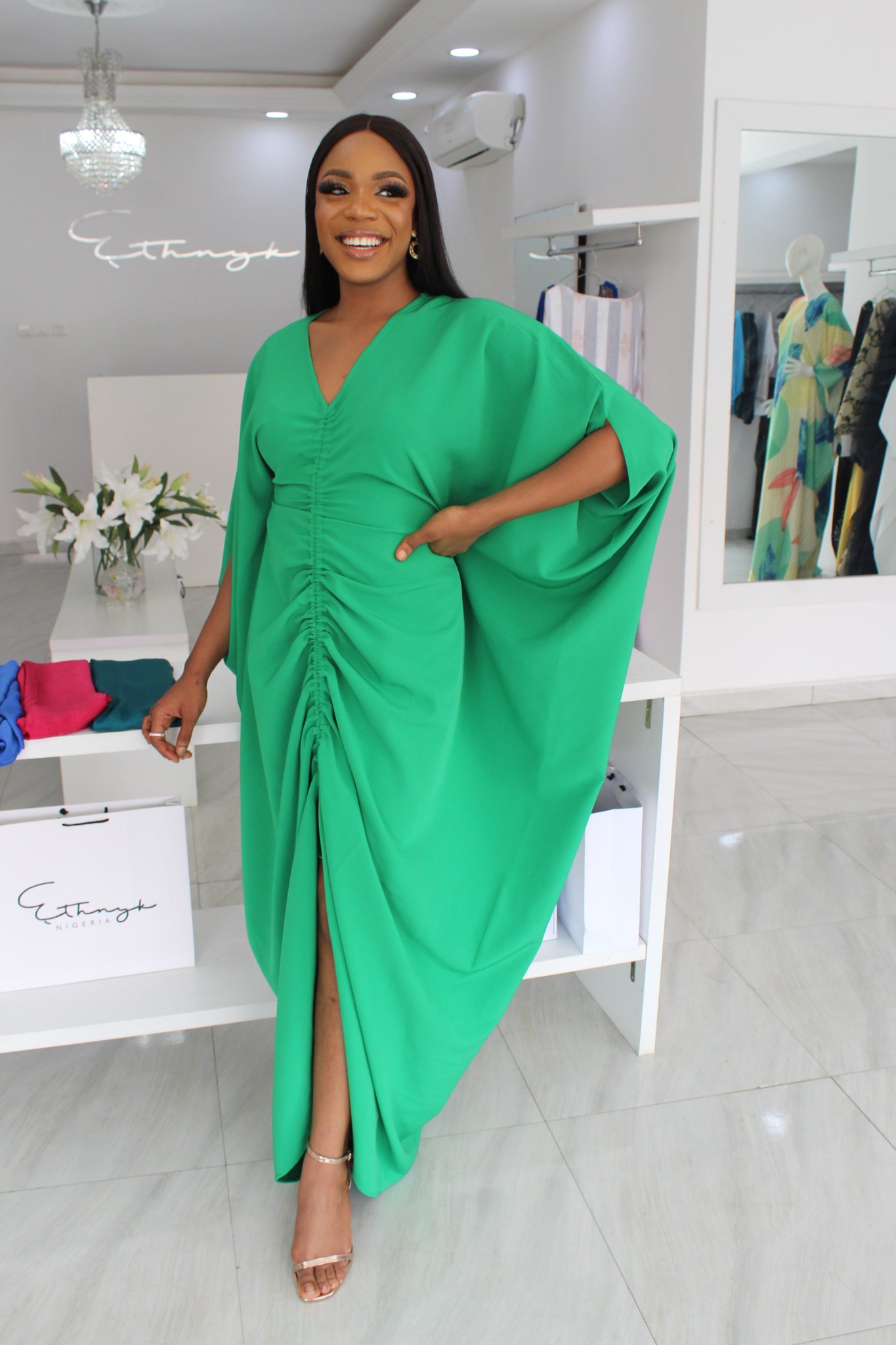 Timeless and chic, our Dayo crepe kaftan in green, a timeless and chic piece that features an invisible belt that gives a figure-shaping ruched detail fit. This classic and sophisticated kaftan offers style, versatility, and comfort, making it a must-have addition to any wardrobe. Its loose features, flowing sleeves, and relaxed fit make it comfortable and easy to wear. It comes in one size and various lengths to cater to different body types and preferences, so you can find a kaftan that fits you perfectly, whether you’re petite, plus-sized, or somewhere in between.